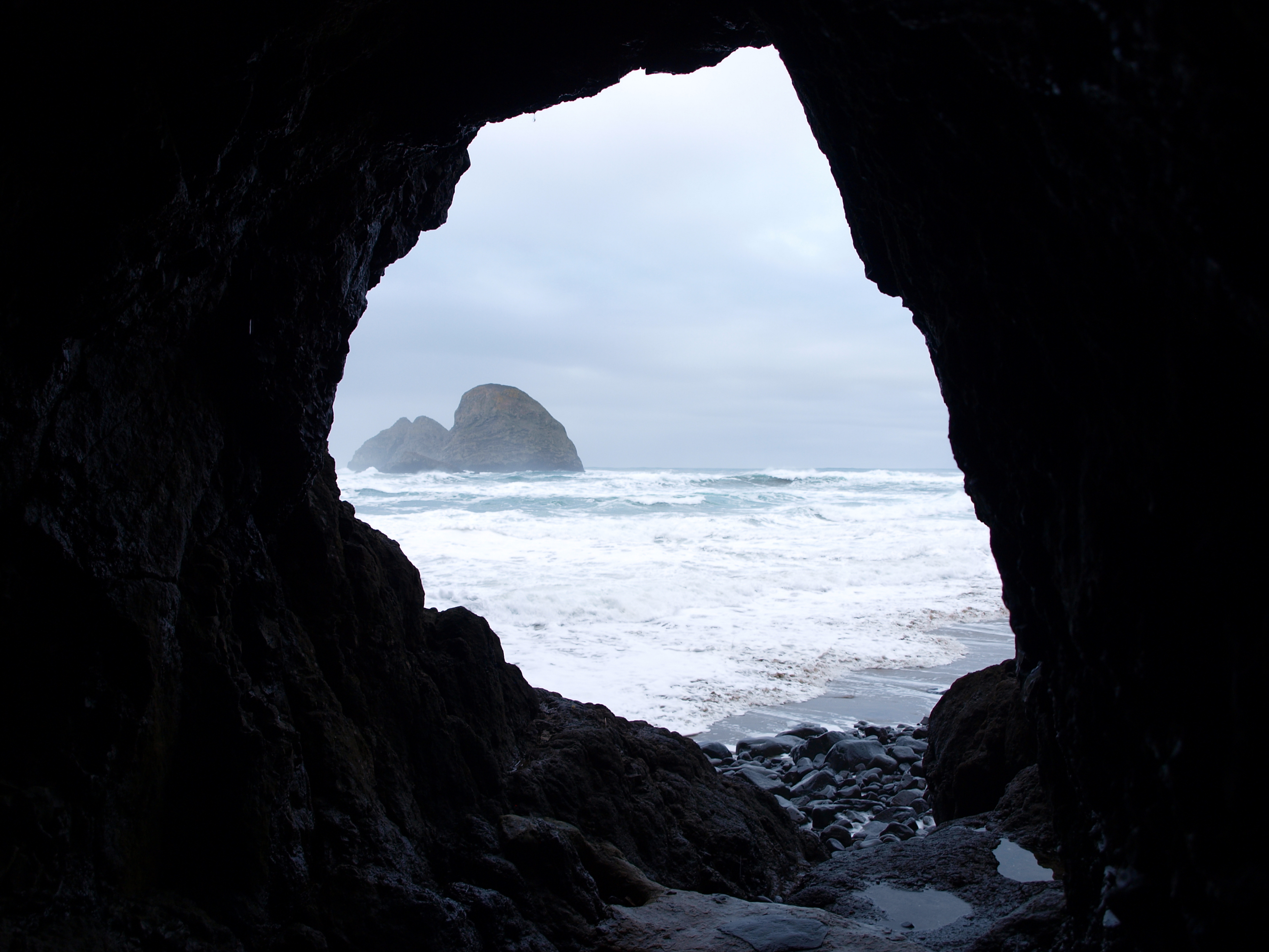 Well rested and very well fed, we continued our journey up the coast to the town of Oceanside. The charming town boasts some wonderful dining options, but at that moment we were quite taken care of in that department. OLYMPUS DIGITAL CAMERAInstead we were there to photograph the Three Arch Rocks and visit something that Jim had told us about just that morning, a tunnel. A short walk along the beach that leaves from the Oceanside Beach State Recreation Site leads to a tunnel that goes through Maxwell Point and leads to the aptly named Tunnel Beach. Constructed by the Rosenberg family in 1926, the tunnel is still passable when the tide is low enough. Our timing was perfect that day as we managed to make it to the tunnel, snap some pictures, and made our way back to the beach as the tide was beginning to lap at our heels.