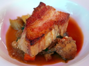Next, we moved into Hair of the Dog territory. Course three was a seared pork belly confit served with a bourbon ribollita, and rainbow chard. Paired with Hair of the Dog’s Fred, 100% aged in a Midwest bourbon barrel from Francois Freres. I don’t mind telling you that I’m generally not the biggest pork belly fan, but I chewed the daylights out of this dish. The texture and the flavor of the meat where very much on point and the ribollita was expertly touched off by the bourbon flavor finish of the Fred.