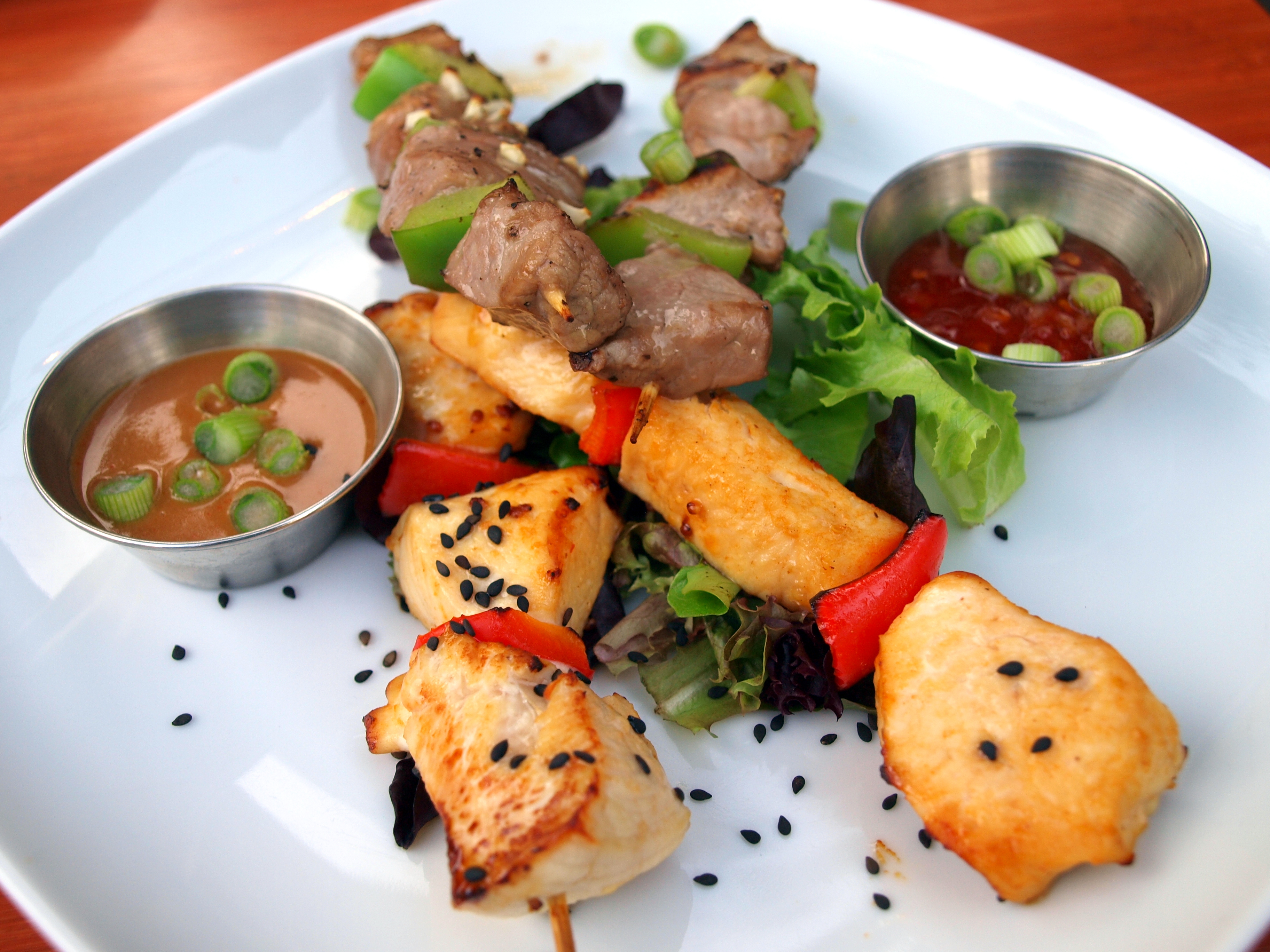 Look at that! That right there is a combination of the Garlic Steak Skewers and the Marinated Chicken Skewers. The steak skewers are baked medium with green bell pepper and served with spicy peanut sauce & green onions. The chicken skewers are baked with red bell pepper and served with sweet chili dressing & black sesam