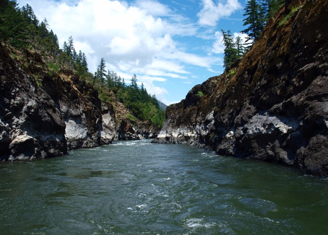 The Rogue River in southern Oregon is one of the original 8 to be included in the Wild and Scenic Rivers Act of 1968. Last week I spent 4 days and 3 nights rafting and kayaking it as part of assignment for Northwest Travel Magazine. The trip, courtesy of Rogue Wilderness Adventures, was almost indescribably beautiful and inspiring. Which is bad news if you’re a travel writer. This picture is a particularly scenic spot called Mule Creek Canyon. You can click on the photo for a larger view.