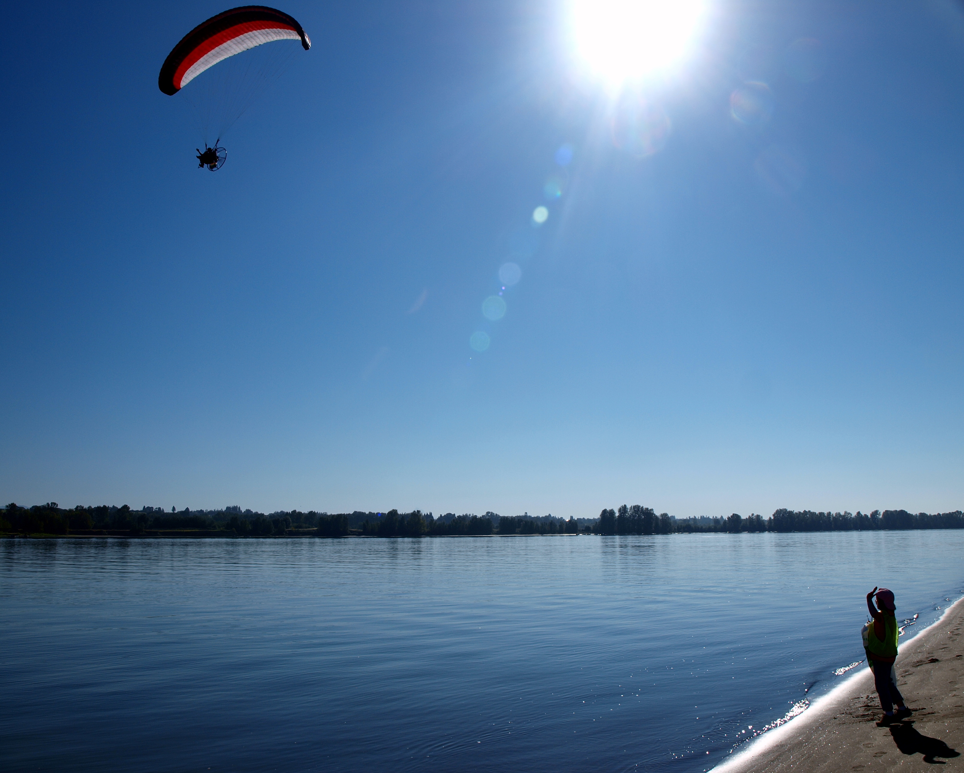 14 02 2011My daughter observes a powered paraglider from a Sauvie Island beach. One of the few times she’s been rendered speechless.