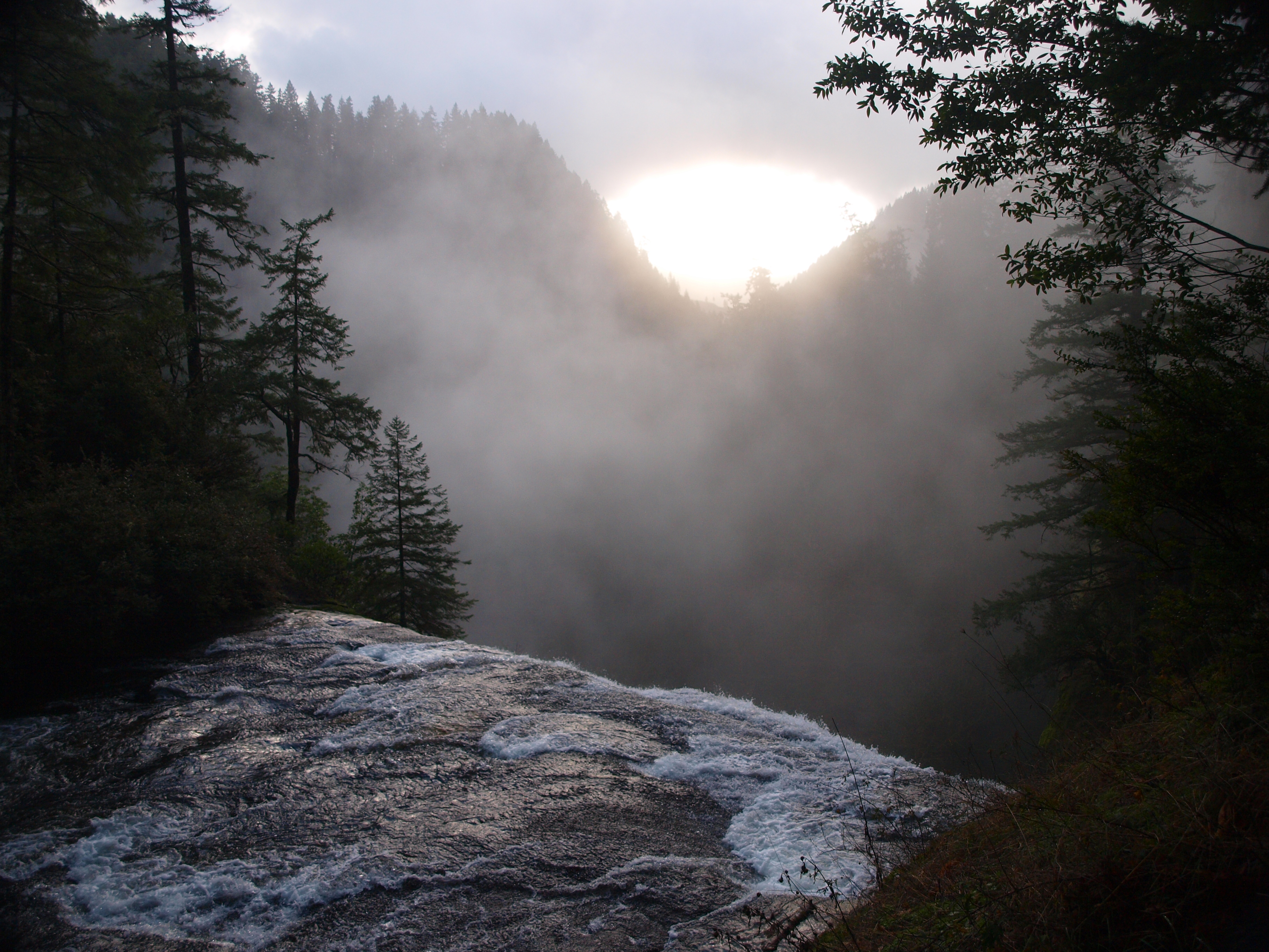 24 12 2012On a recent waterfall trip to the Coos Bay area I stayed at the Below the Falls Lodge. The lodge is quite literally about 1.5 miles downstream from the Golden and Silver Falls State Natural Area. Both falls were great and the trail leading above Golden Falls was particularly unique. Low clouds and fog swept in and out of the canyon the entire time we were there, making for some interesting photos. This shot is from the top of Golden Falls, looking out into the clouds and sun as Glen Creek takes a plunge.